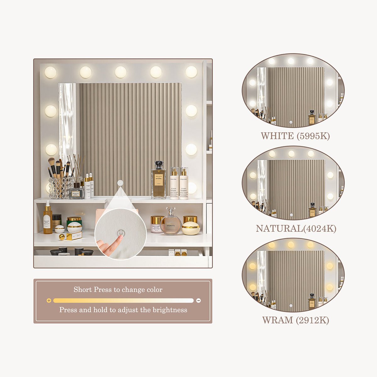 【 Vanity Desk with Large LED Mirror】Large clear mirror with 10 three-color and brightness adjustable LED bulbs, with three modes, warm, natural, and cold, the brightness of the lighted mirror can be adjusted according to different scenes and makeup needs by pressing the screen for a long time.
